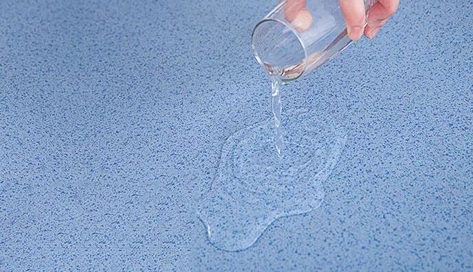 选购PVC塑胶地板时,我们的销售人员都会跟消费者说,PVC地板防潮防水,所以消费者在使用过程中就有些肆无忌惮了,PVC地板防水性能再好,也不能被水浸泡,这样会影响PVC地板的使用功效,严重的还会损坏PVC地板。所以说,PVC地板防水性能好是与木地板相比的情况下,比如下图,水洒在PVC地板上,只要及时擦拭,不会对PVC地板造成损伤。