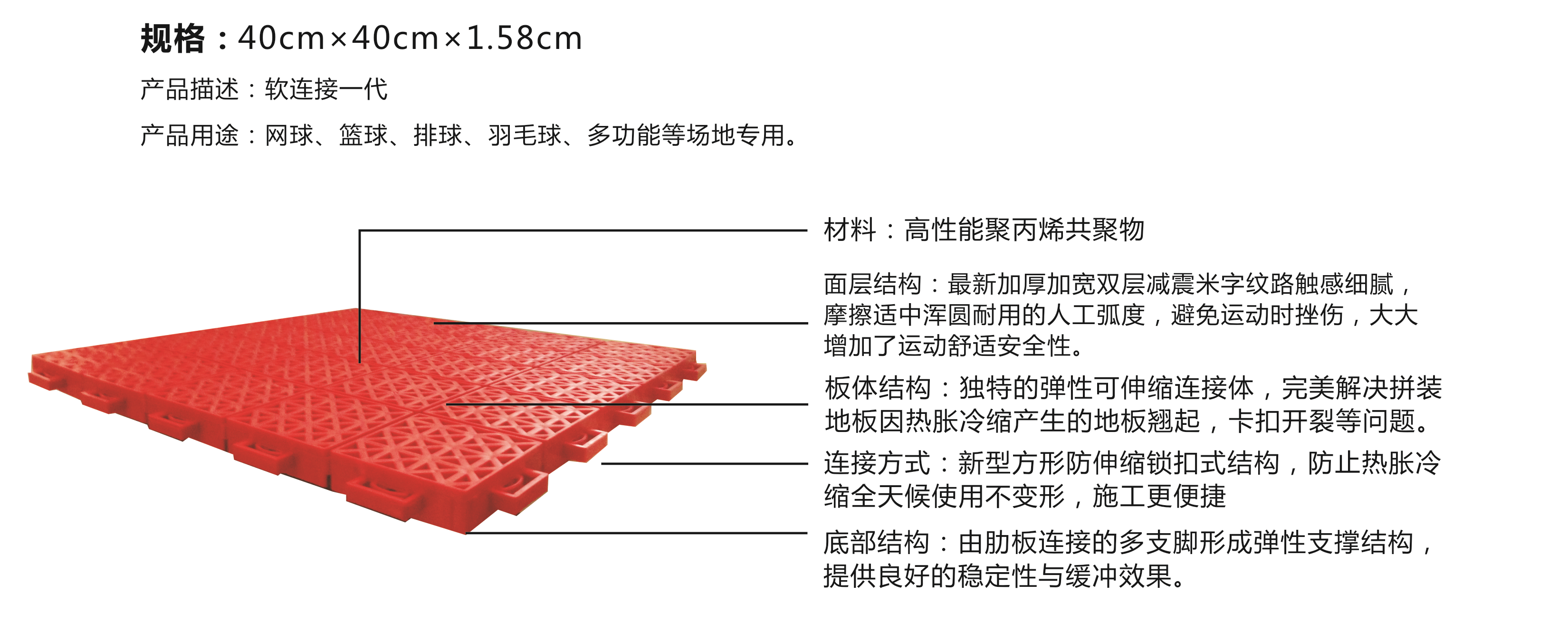 应体验反馈与市场潮流所向,软连接一代拼装地板表面升级为经典米字格纹理,避免运动挫伤,增强运动中的耐磨、防滑、舒适的同时,场地整体铺装美观大方,清洁维护更为方便,形成了更为专业、卓越的产品优势。是网球、羽毛球、篮球、排球等运动场,休闲活动中心、娱乐中心、儿童游乐场等多功能场所场地的多功能小帮手。